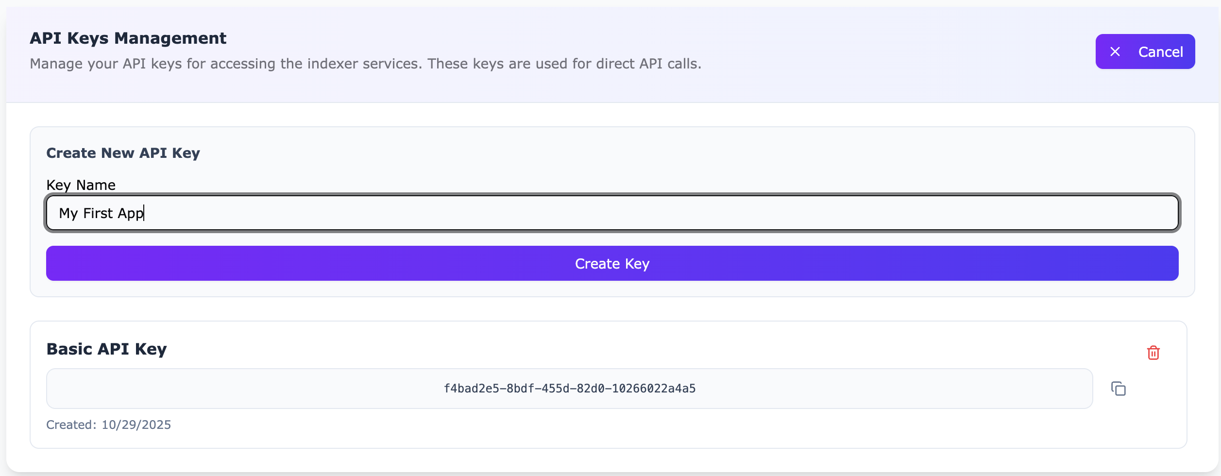Your first API key is created automatically when you register. To manage multiple environments or applications, create additional keys in the API Keys Management section.