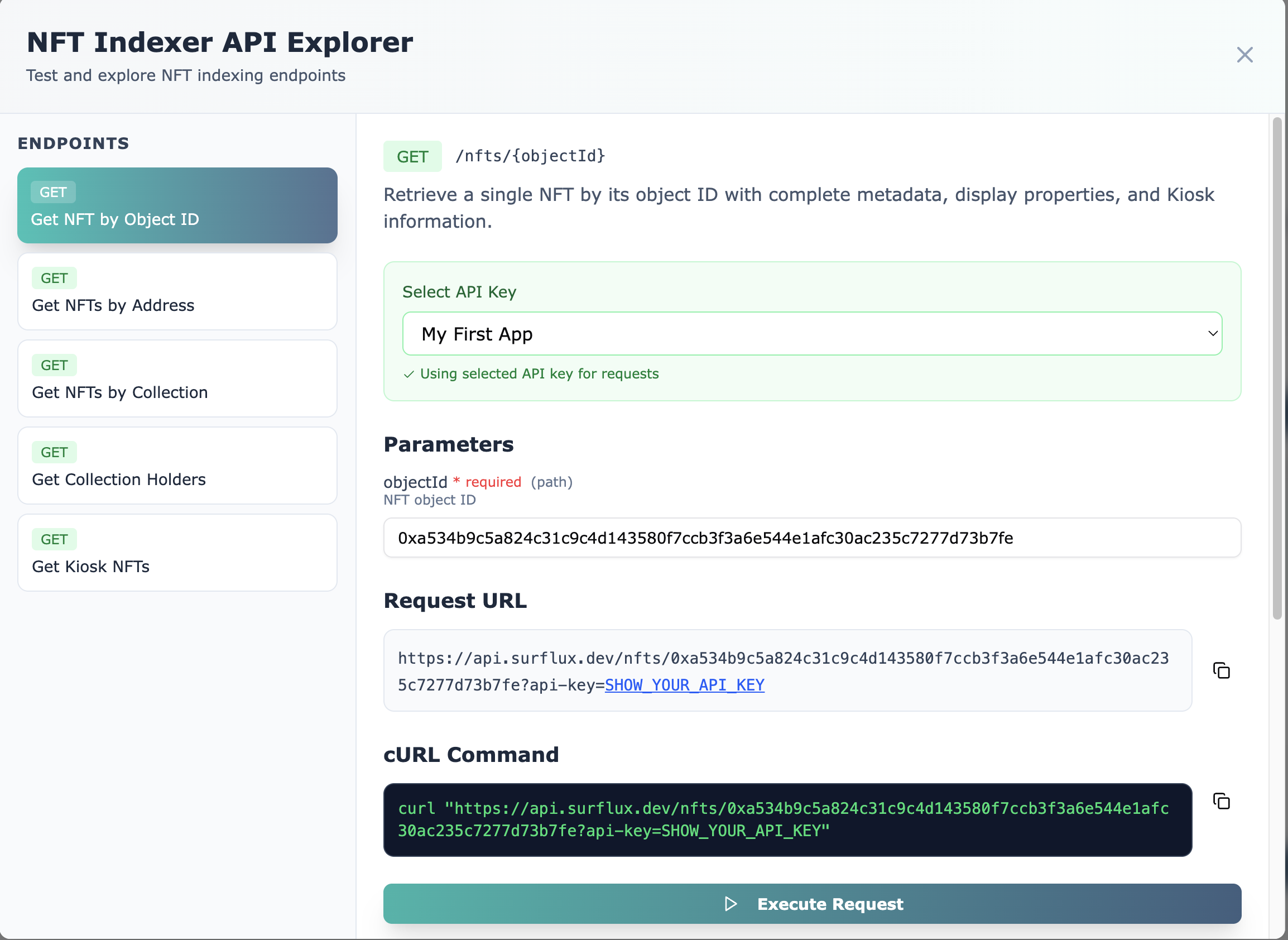 The dashboard includes an interactive API explorer, perfect for testing without writing code. Let's query an NFT by its object ID using the NFT by Object ID endpoint.