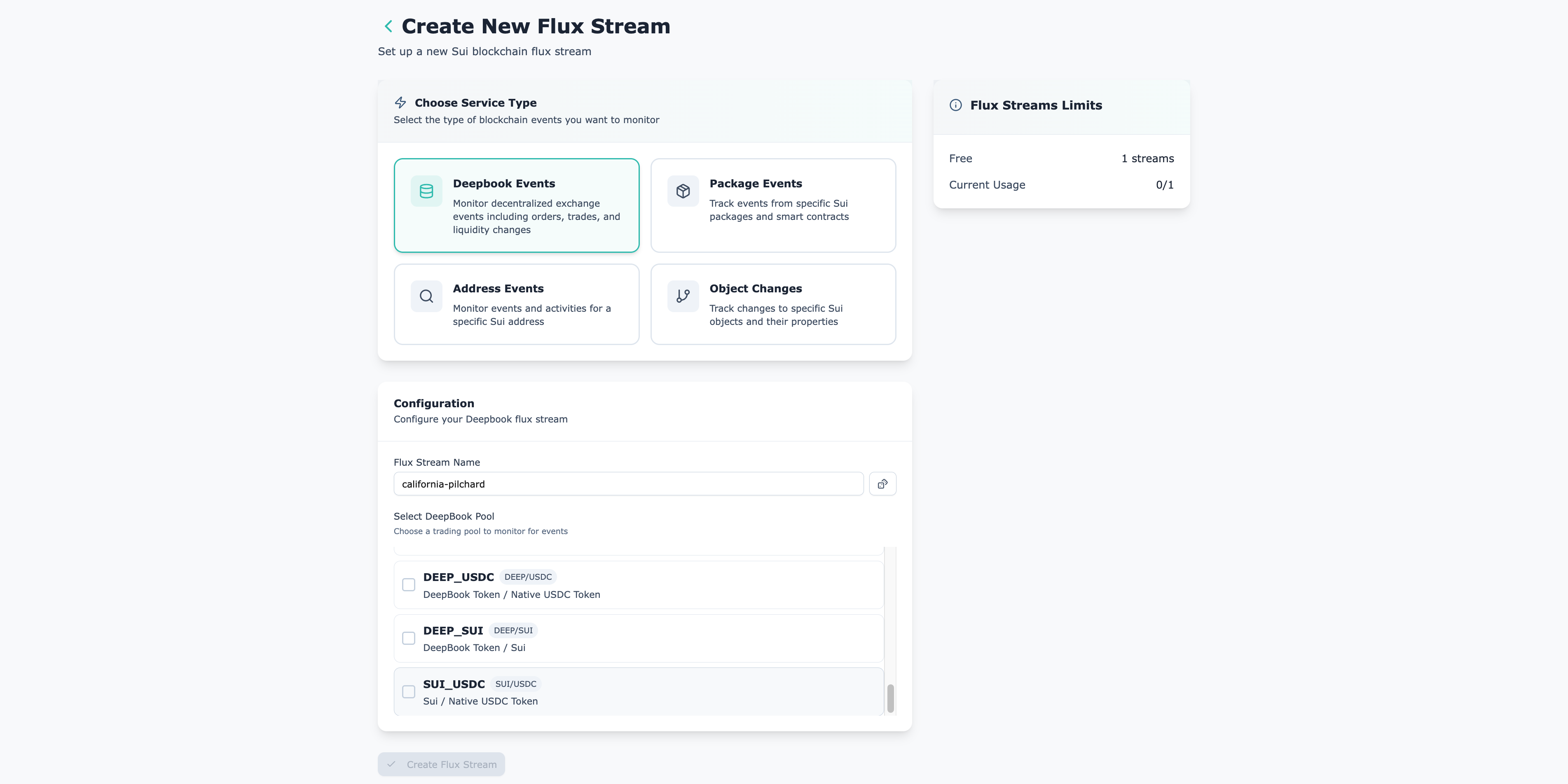 Flux Streams deliver real-time blockchain events directly to your application. We'll create a DeepBook Flux Stream to monitor the SUI/USDC trading pool. No polling, no delays, just instant updates.