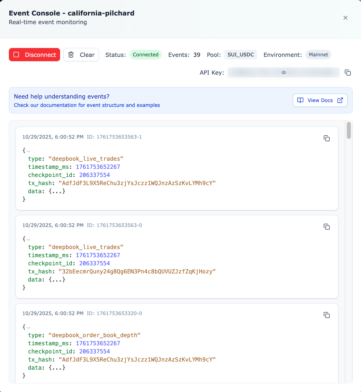 Once your stream is live, the dashboard shows events as they happen on-chain. Observe trade executions, order book updates, and timing patterns to understand the data flow before integrating into your app.